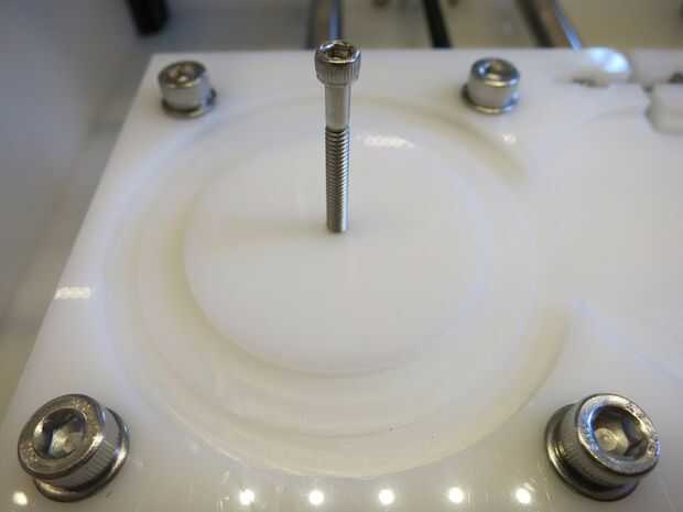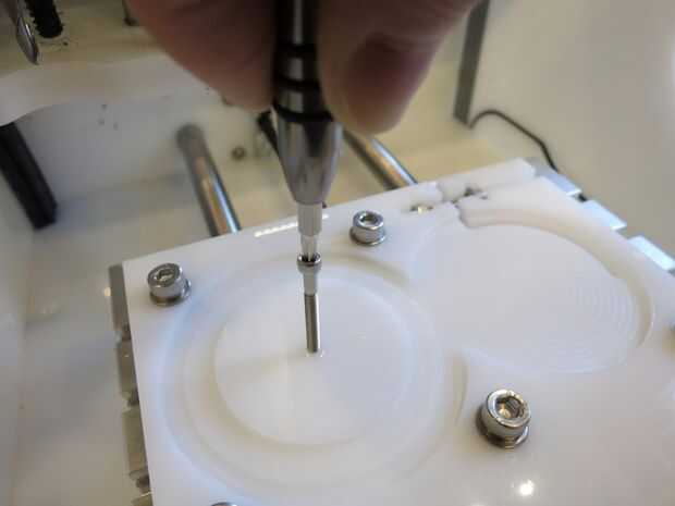 Con el tornillo de cabeza hexagonal #2-56, conducirlo en el agujero en el lado izquierdo de la plantilla hasta que llegue a la parte inferior del agujero. Es un ajuste apretado, pero deben formar sus propias roscas. Tenga cuidado de no pelar hacia fuera el agujero.