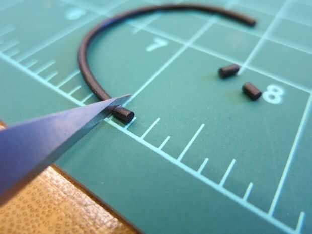 Ahora vamos a cortar pequeños trozos de goma que sujetan el yo-yo de las tuercas hexagonales en lugar. Corte perpendicular de la junta tórica a la curva y luego cortar las piezas de 1/8" de largo la misma manera. Cortar las tres piezas para cada mitad.