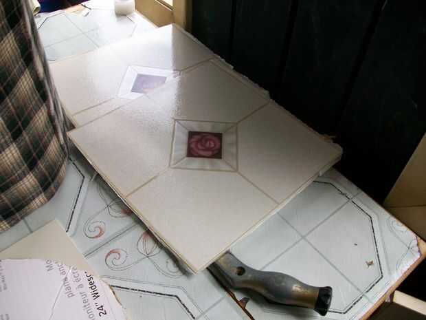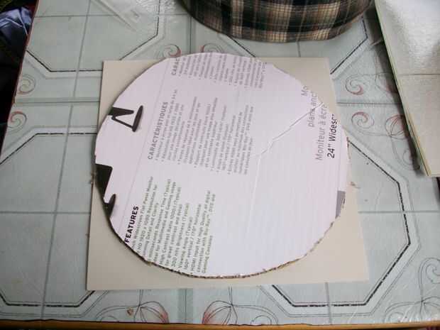 Tomar el papel de la hornada al lado de una de las losetas del piso y coloque el círculo de cartón en la misma. Presione con firmeza para asegurarse de que está bien conectado. Utilizando la navaja cuchillo cuidadosamente traza alrededor del círculo. una vez que ha sido anotado el azulejo puede ser fácilmente roto.