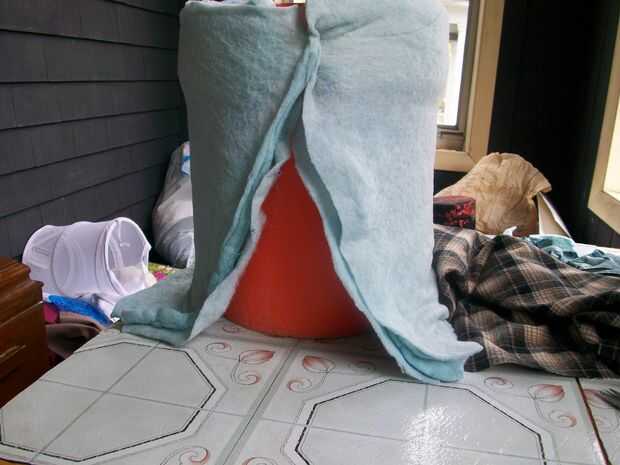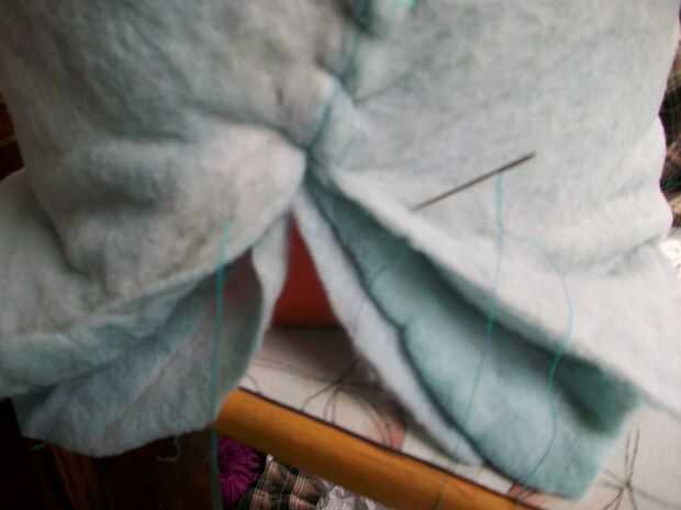 Envolver el cubo con 2 piezas de bateo se corta de la colcha vieja, capas una encima de la otra como se muestra en la imagen. . Perno en su lugar.