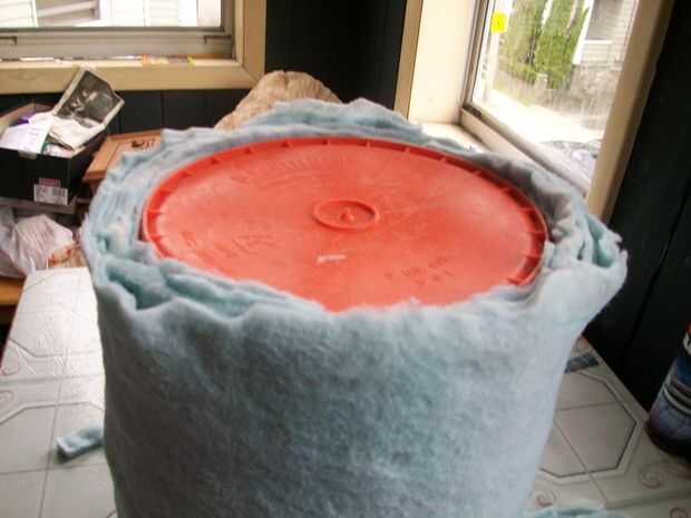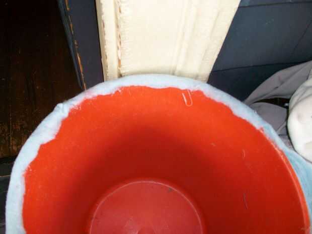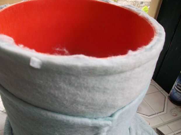 Trim bateo incluso con la parte superior e inferior del cubo. Usando la pistola de pegamento caliente, pegar el bateo hasta el borde inferior del cubo. Lo mismo para el borde superior de la canastilla.