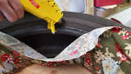 Voltear la llanta una vez más, llevarlo hacia fuera la mitad de las grapas de la tela y pegamento caliente en el borde interior. Repita el paso con la otra mitad de la tela.