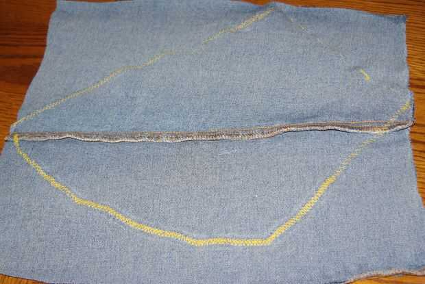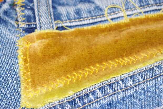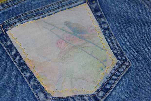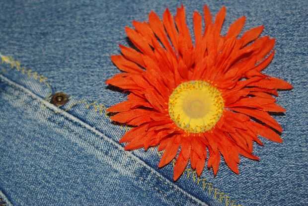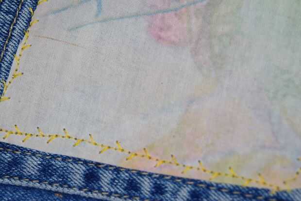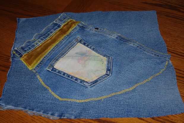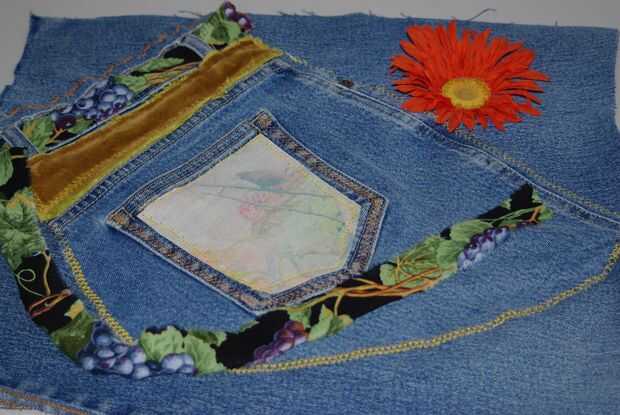 corte el área del muslo de una pierna de los pantalones vaqueros en aproximadamente 15" cuadrada para la base delantera y otra pieza de un área de bolsillo trasero para añadir interés. Cosidas en una imagen de transferencia de tejido de uno de mis gráficos de computadora en el bolsillo y me hizo varias puntadas diseñador alrededor de eso y al fijar la pieza con el bolsillo a la Plaza base. He utilizado algo vintage de tela para el forro a contraste y había dejado una pieza que agregué más color para el lado de jean. Puede agregar lo que usted tiene le dan un aspecto otoñal. También utiliza una flor de seda en color naranja y cortar otra transferencia de tela pequeño de un girasol para el centro de la flor. Añadí algunos izquierda sobre tejido de vid para un aspecto de la correa de lazo y había atado a través de las lengüetas del cinturón y había cosido en su lugar.