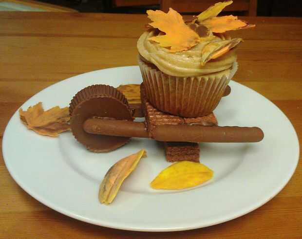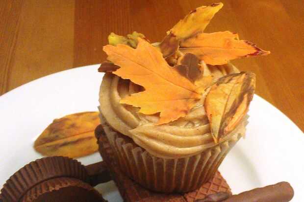 estos son pastelitos de especias con un glaseado de crema de canela y vainilla. Me había decorado con hojas de chocolate caseros y había servido en carretillas de chocolate totalmente comestibles.