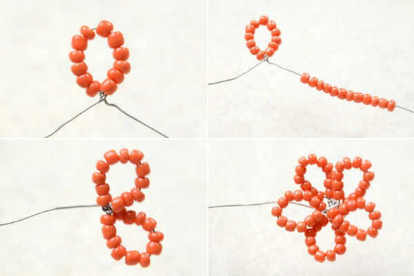 1 º preparar un cable de 40 cm 5mm de cobre, 12 granos de la semilla para alambre, envolver un bucle y tuerza el alambre para fijar el lazo del hilo de rosca y luego añadir 12 rocallas para alambre, envolver un bucle y tuerza el alambre, siguen otros tres pétalos;