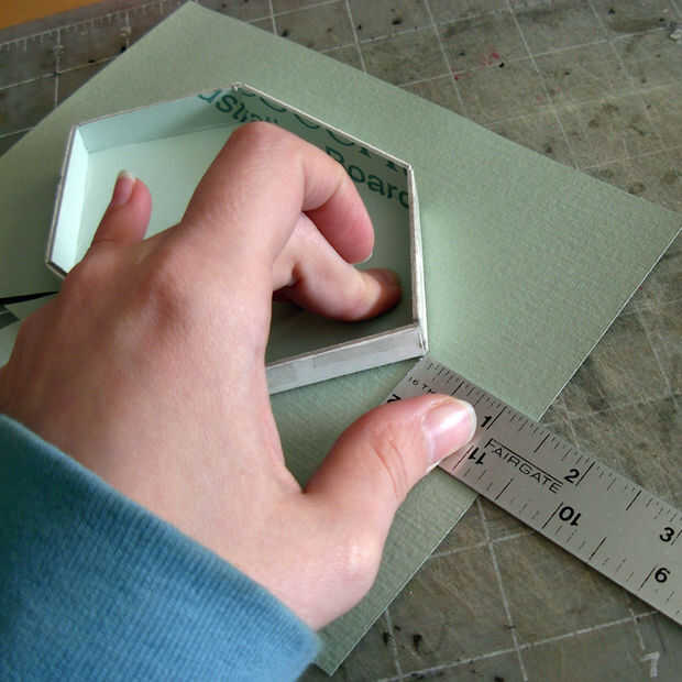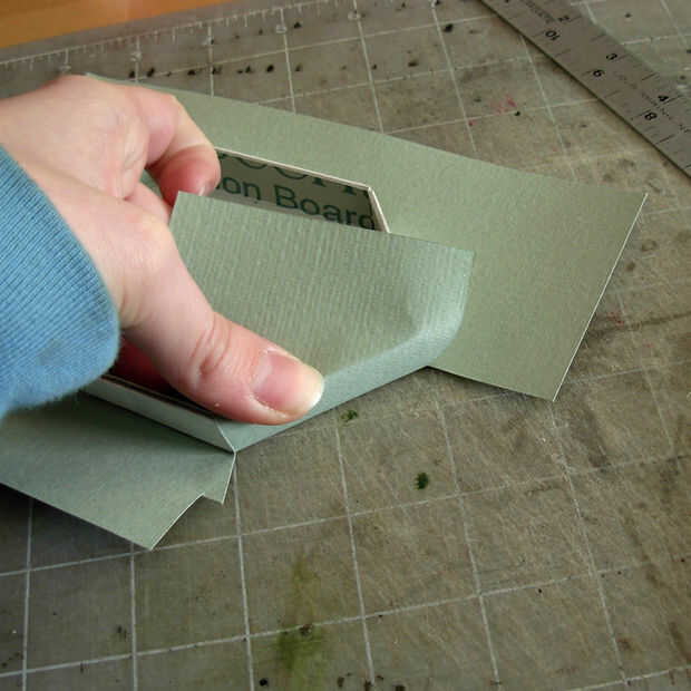 Sostenga la regla al ras con el primer lado del ángulo de la caja, directamente en la esquina de su anterior corte y recorte el exceso de papel (Foto 1). Luego, hacia la esquina más aguda de la caja y alinear su paralelo de regla con el lado largo de la caja y hacer un corte desde la esquina hasta el borde del papel (Foto 2). Ahora debería tener una segunda aleta para trabajar con.