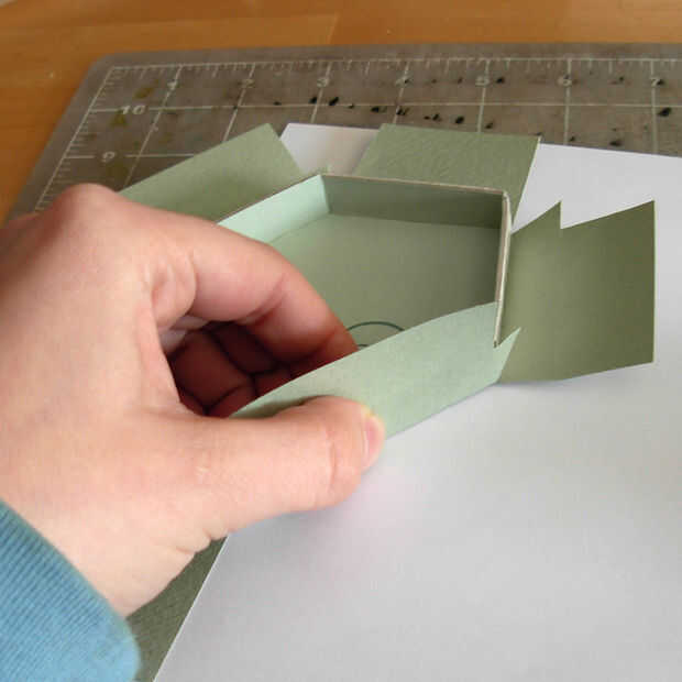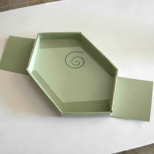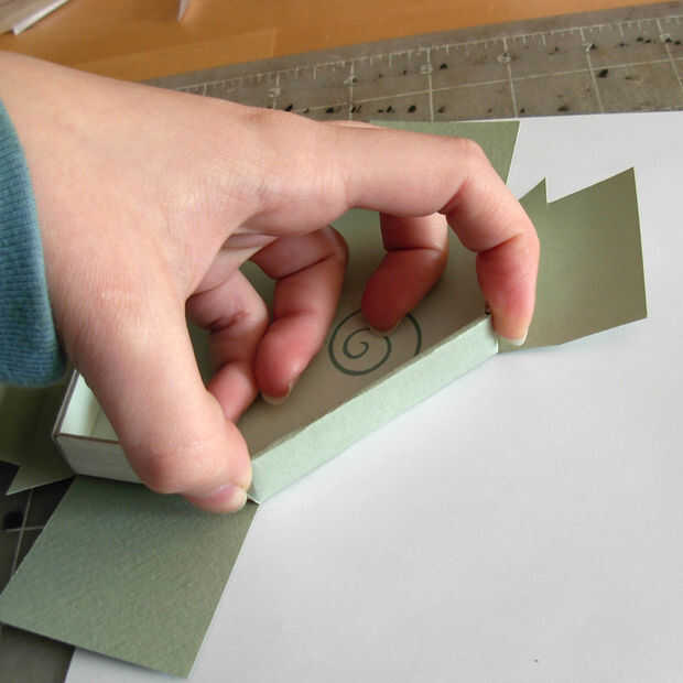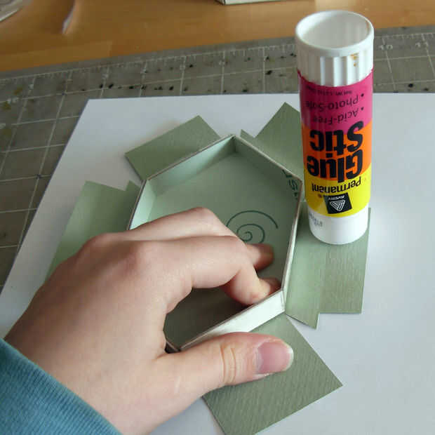 Coloque su caja con solapas de corte hacia abajo en su pedazo de papel. Comenzando con el lado largo, recorra todo el palillo del pegamento sobre el papel de la cubierta incluyendo los bordes y las aletas (Foto 1). Doblar el papel hasta el lado de la caja (Foto 2) y suavemente aplique presión a las aletas contra la caja para que pegue (Foto 3). Repita con el lado angulado que tiene una aleta. (Que parece un 1 hacia atrás.) Skip el recto aletea y continuar pegando el próximo lado largo y lateral con una aleta en ángulo. Debe tener una caja que parece foto 5. Pegar las aletas hasta el último. No debe ser cualquiera del tablero original ilustración de la caja que muestra a través del papel.