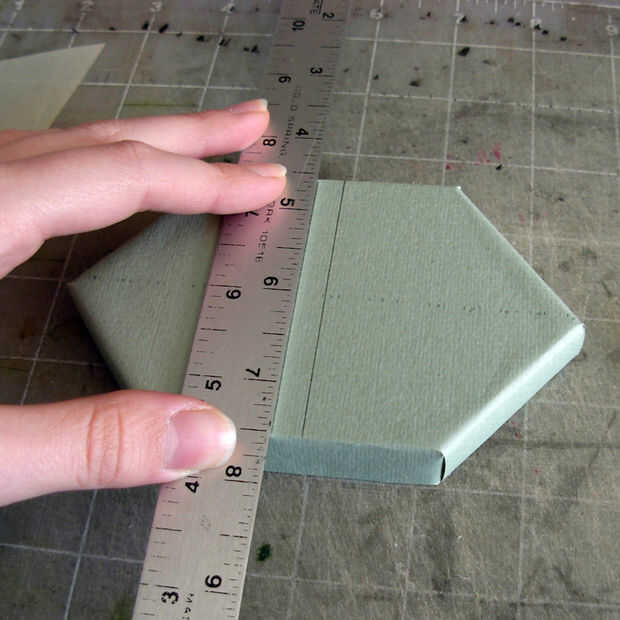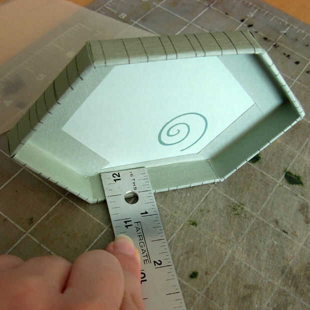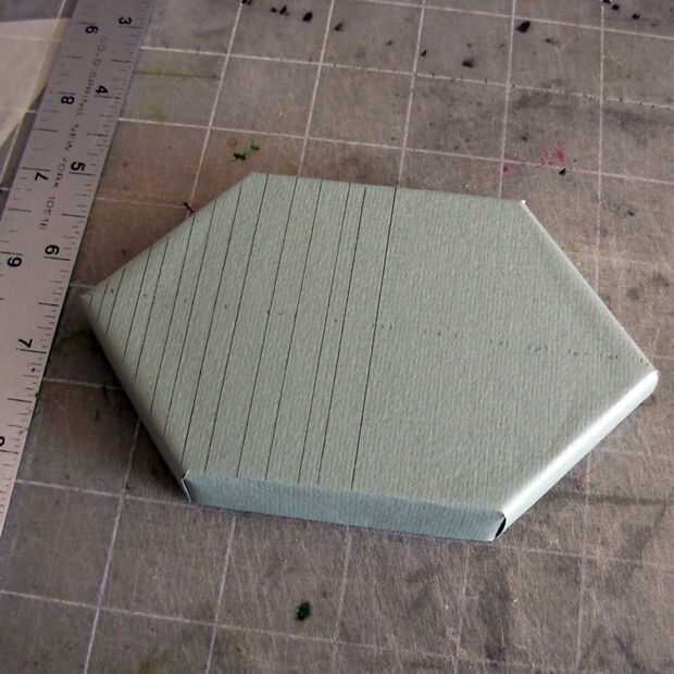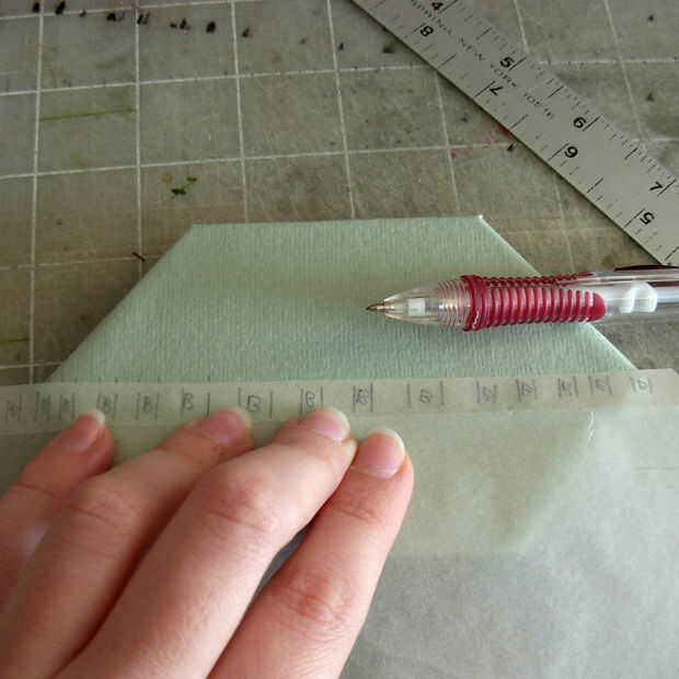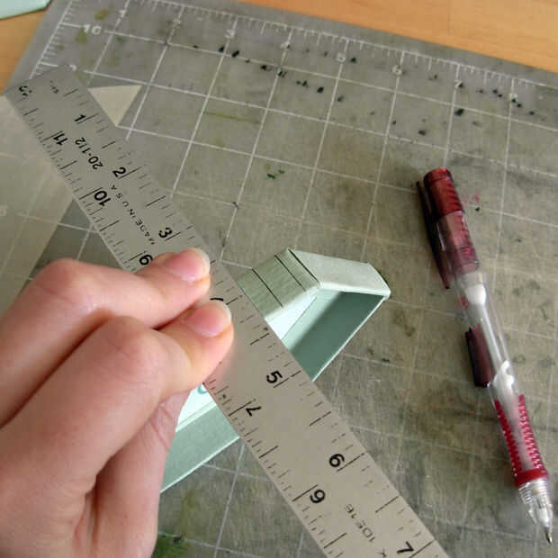 Utilizando la plantilla y un lápiz, marcar el ancho de tus franjas (Foto 1). Añadir una pequeña "x" a donde sé que quiero que sea negro sólido. Luego use su borde recto para marcar las líneas de uso de las marcas como guía (Foto 2). Siguen las rayas todo el borde de la caja, incluyendo el interior de la tapa (fotos 3-5).