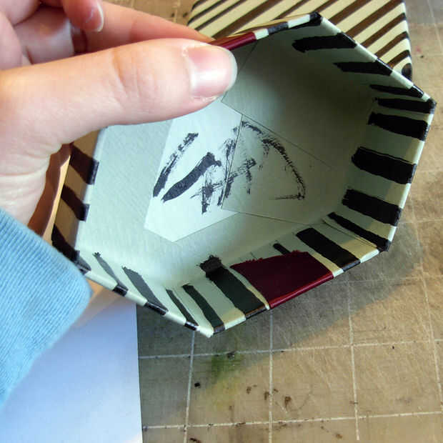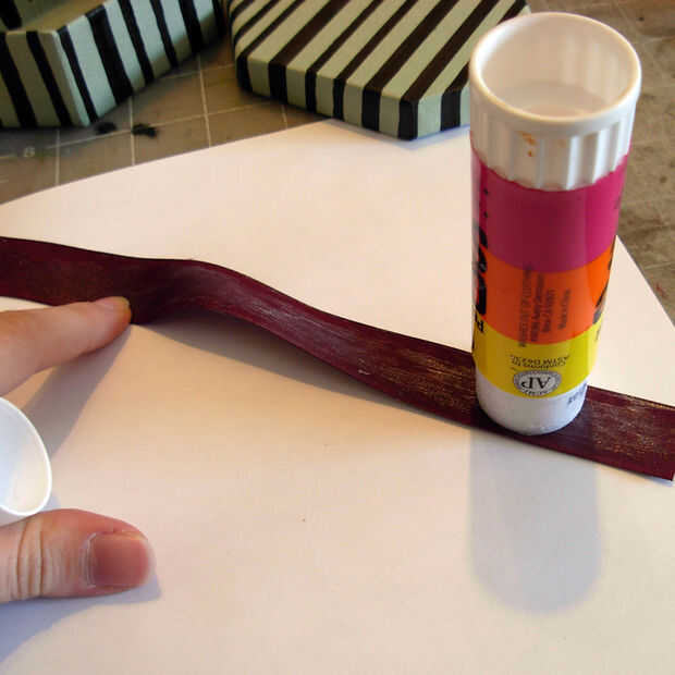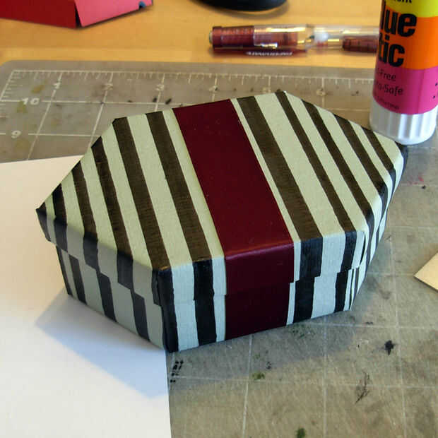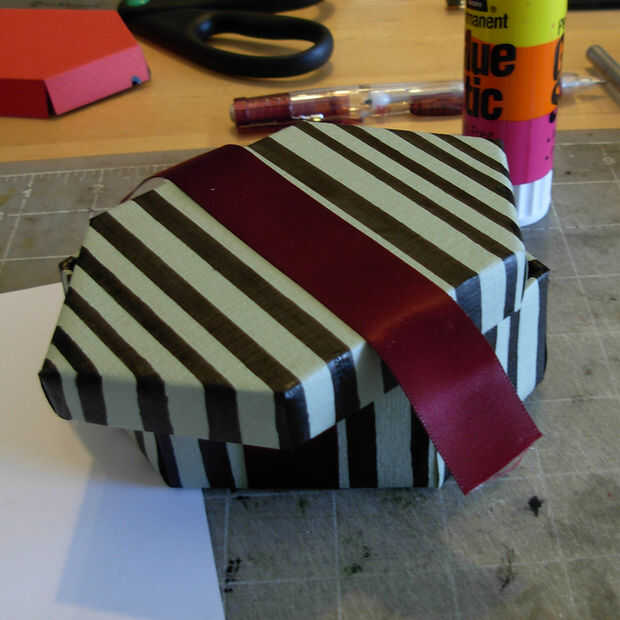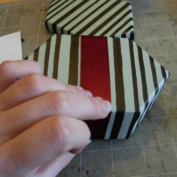 Mida la cinta colocando en la caja. Cortar las piezas un poco largo, recordando que lo quiere llevar en el interior de la caja inferior y superior. Decidir de qué lado de la cinta que desea ser boca arriba. Coloque la cinta boca abajo en el papel de desecho y aplique el palillo del pegamento a lo largo de su espalda (Foto 1). Desde el interior (Foto 2) y fijar la cinta al centro de la caja, teniendo cuidado de seguir recto (Foto 3). Repita el procedimiento en la parte superior de la caja y comprobar su alineación (foto 4). Igual que las rayas, la cinta debe alinearse (Foto 5).