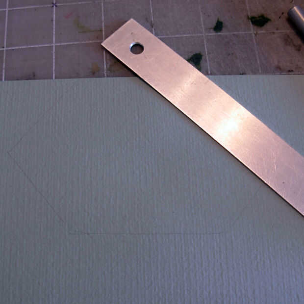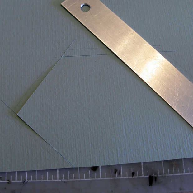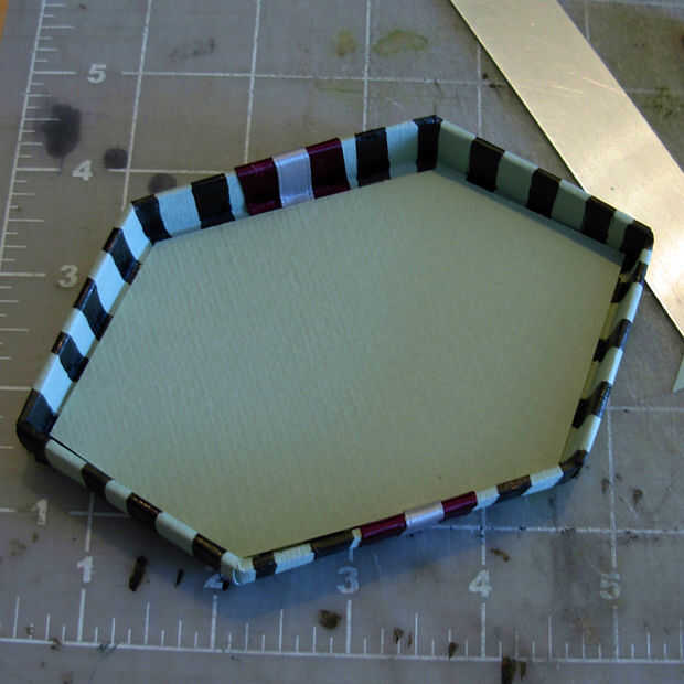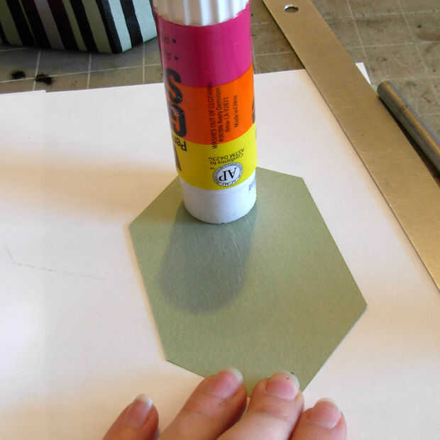 Para cubrir el medio desagradable de la caja, necesitará cortar un forro interno. Coloque la caja en una pieza de las sobras que cubre el papel y trace una línea alrededor del borde. Con tu regla, marca dentro de la línea alrededor de 1/8 de pulgada (Foto 2). Corte este hexágono más pequeño con su regla y cuchillo (Foto 3). Compruebe el ajuste del forro. Si es demasiado grande, cortar para que quepa. Una vez los ajustes, coloque el forro en el desecho de papel y pegamento a los bordes (foto 4). Luego presiona el lado pegado hasta el interior de la tapa de la caja (Foto 5).