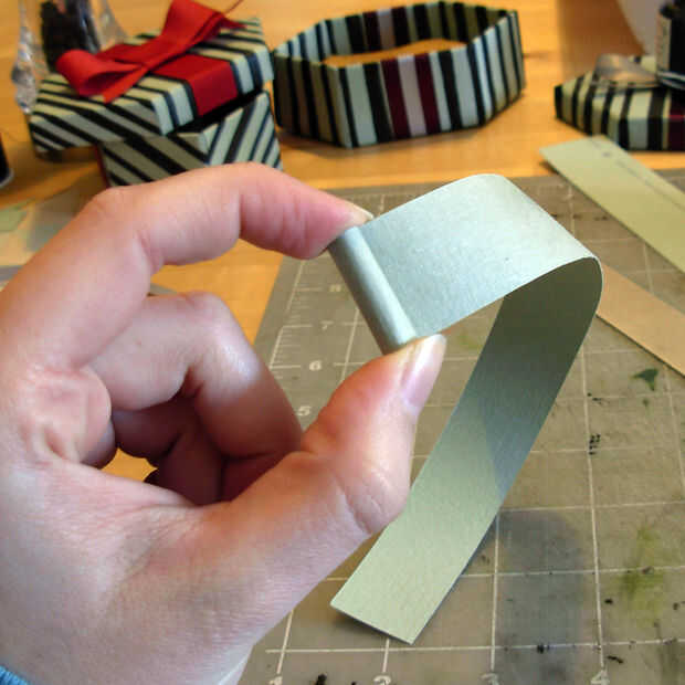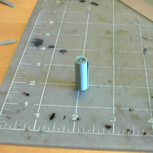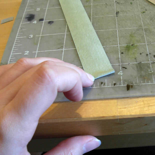 Cortar una tira de papel 3,4" de ancho por 12" largo (Foto 1). Poner la tira en el papel de desecho y cubrir un lado con el pegamento (Foto 2). Comience en un extremo y doblar la cola hacia el interior (Foto 3). Sigue el papel por un rodillo (foto 4) hasta que tenga un buen tubo para el centro de la bobina (Foto 5).