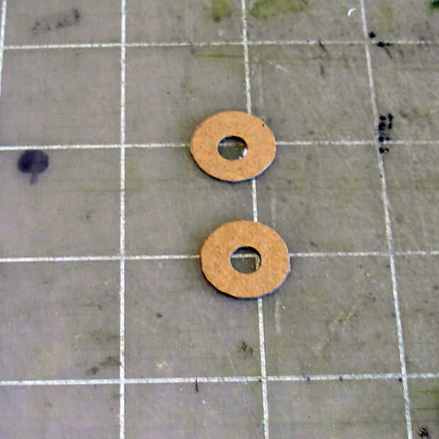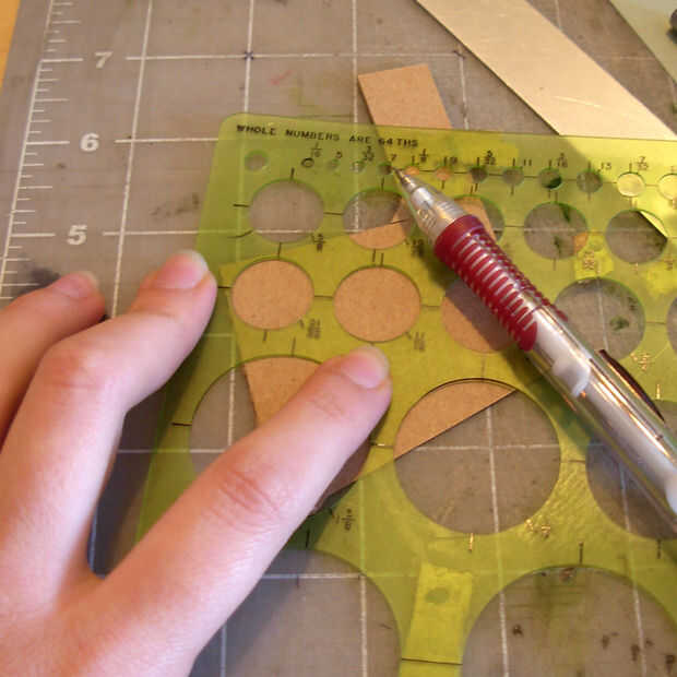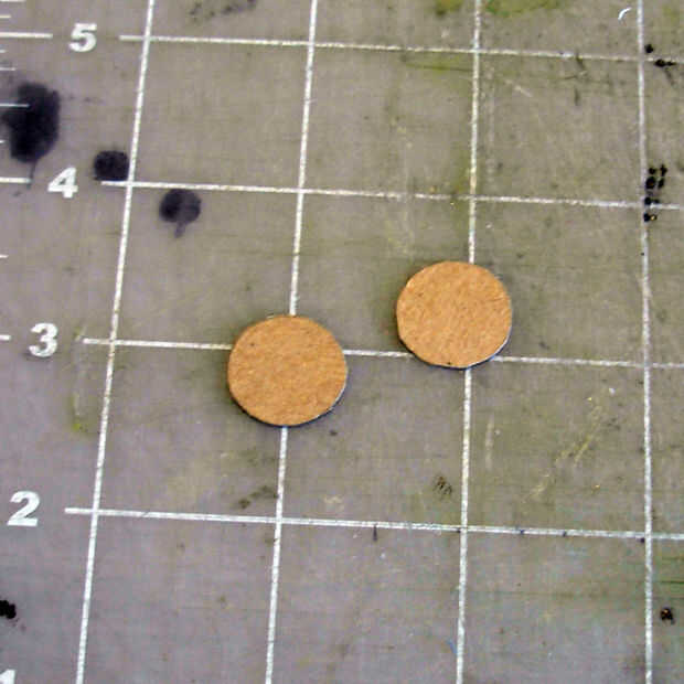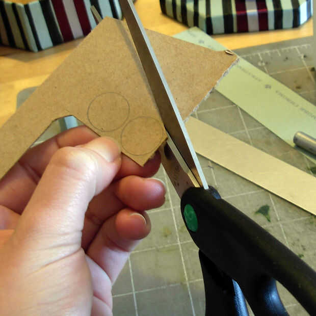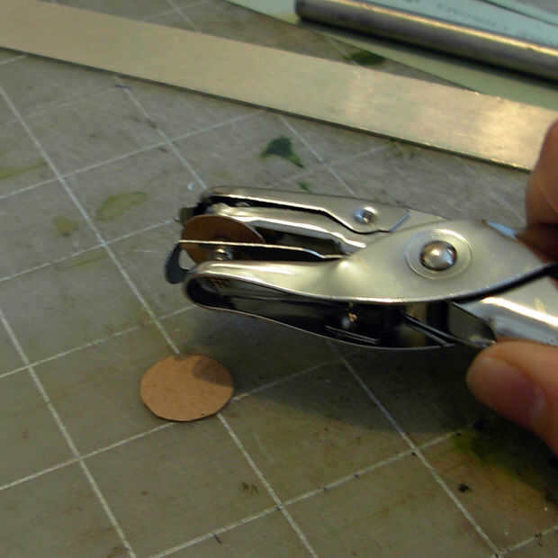 Empezar por remontar dos 0.5" círculos en el pedazo de cartón delgado (Foto 1). Cortar los círculos con las tijeras (fotos 2 y 3). Utilizar la perforadora hacer un agujero en el centro de cada círculo cortado (fotos 4 y 5).