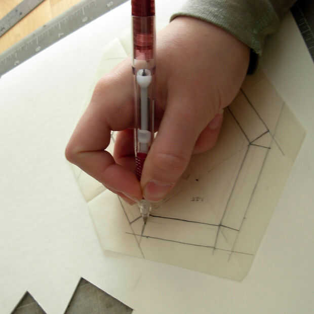 Lo que hago es trazar las líneas sólidas de la plantilla con un lápiz suave. Esto es hacer una especie de pseudo papel. Se puede trazar directamente sobre la plantilla impresa o en un papel que es lo que estoy haciendo en la segunda foto. Cuando se han trazado las rayas listo transferir el diseño a la Junta de la ilustración.