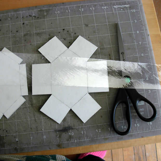 Con sus tijeras, corte pequeños trozos de cinta de embalaje para asegurar las esquinas de la caja superior e inferior (foto 4). No tienes que momificar los bordes con cinta adhesiva; un pedazo pequeño debe ser suficiente. Cuando hayas terminado taping, debe tener su caja básica y superior creado (Foto 5).