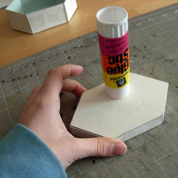 Ahora es el momento de cortar las piezas para cubrir la caja. Usar la regla para ayudar a estimar el tamaño que va a necesitar. Usted querrá un pedazo que es lo suficientemente grande como para cubrir tanto el exterior y dentro de la caja de los bordes (Foto 3). Siempre voy con un poco más del doble del tamaño de la arista de la caja. Cortar las piezas para la parte superior e inferior y luego utilice el palillo del pegamento para untar pegamento en toda la parte plana de la pieza de la caja (foto 4). Luego coloque el lado del pegamento de la caja hacia abajo en el centro de la cubierta de papel.