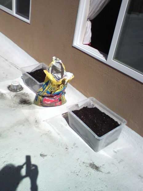 Vi 25' de la barrera de las malas hierbas por $7 en nuestro local OSH; Si usted esta había repartido en 7 cubos (una buena estimación), es $1/bin, trayendo el total a menos de $15, incluyendo las plantas de tomate.