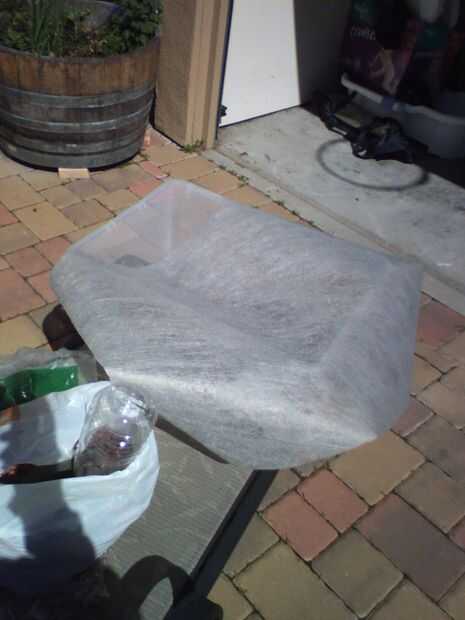 Este es el paso semi exclusivo. En lugar de la tapa de la caja (inteligente), otro bin (bastante bien, pero caro), utilicé algunas malezas barrera tenía en el garaje. Se supone que para mantener las malas hierbas pero permite que el agua a través. Si necesitaba comprarlo, era cerca de $15 por 100 pies, según la etiqueta que he encontrado en él. Cortar dos veces el tamaño de la parte inferior del recipiente. Colocar en recipiente, doblar esquinas y alguna suciedad en para mantenerlo en su lugar. HACER que usted lea el siguiente paso antes de hacerlo realmente, como estos dos pasos van juntos.