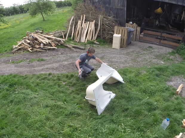 Tratar de encontrar una vieja bañera de acrílico y cortada en dos - o comprar uno nuevo y disfrutar de destruirlo. Necesitarás la parte posterior lateral, recuerda - aka el lado que está ligeramente curvado también conocido como el lado sin el sumidero de evacuación.