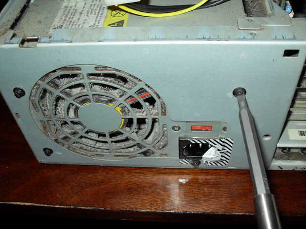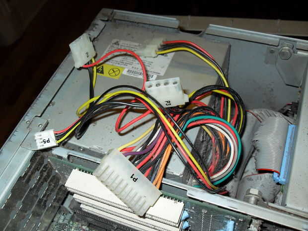 La fuente de alimentación no demasiado difíciles de identificar o de abeja. Desde el exterior de la caja, se puede saber dónde está debido al gran fan y el zócalo en donde conecta el cable de la computadora (Foto 1). En la mayoría de los casos es un interruptor cerca del zócalo y del ventilador. Una vez dentro, usted también podrá ver que la fuente de alimentación es una gran caja gris con un paquete grande de alambres multicoloras sobresale (Foto 2).