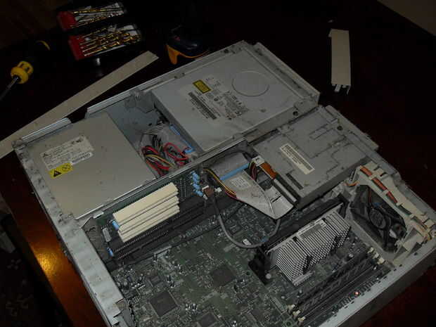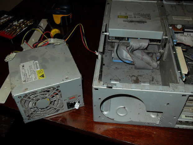 Después de la fuente de alimentación debe levantar derecho de la caja (foto 6). Para este proyecto no necesita el resto del equipo, pero ten en cuenta que todavía contiene muchas partes útiles como ventiladores, motores, cables de cinta, condensadores y resistencias, sólo por mencionar algunos. Además, los pernos de la CPU están hechos de oro.
