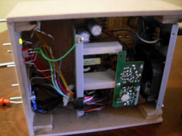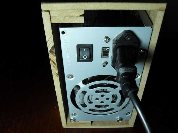 El recinto no tiene una parte posterior. En cambio, la parte posterior de la caja de suministro de energía hace para arriba. Esto permite el acceso a la toma para el cable de alimentación y el interruptor general. También el ventilador expulsar el aire de escape. Pequeñas aberturas arriba y abajo el caso permitir que aire fresco entrar en el recinto (Foto 2). El caso de suministro de energía es encolado en el recinto.