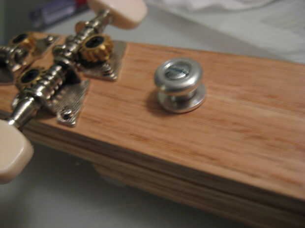 Por último, Monte los botones de la correa en la guitarra. Montado uno en la parte posterior del cuello hacia el cabezal y para la parte posterior de la lata (éste requiere un michine tornillo y tuerca en lugar del tradicional tornillo de madera)