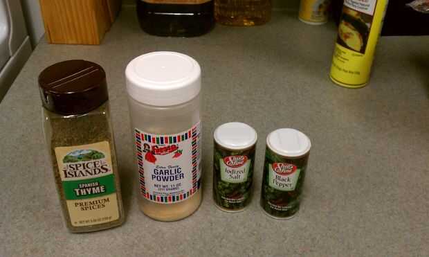 Especias, Yo usé tomillo, ajo en polvo sal y pimienta, pero realmente cualquier cosa que desee.