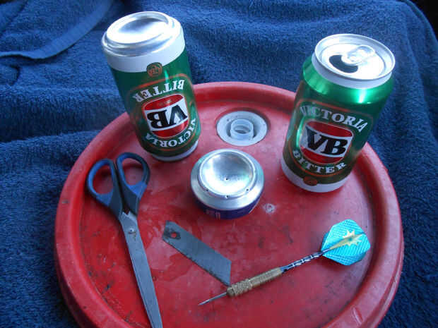 Todo lo que se necesita para esto es dos latas (preferiblemente iguales), un par de tijeras, una cuchilla y un dardo.