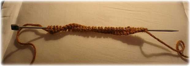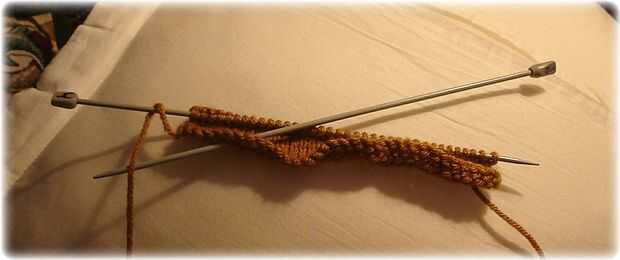 Con agujas de 3mm echa sobre 36 puntadas en hilo de oro y 7 hileras en punto jersey de punto. (Llano de una fila y una fila revés, a partir de una simple fila.)