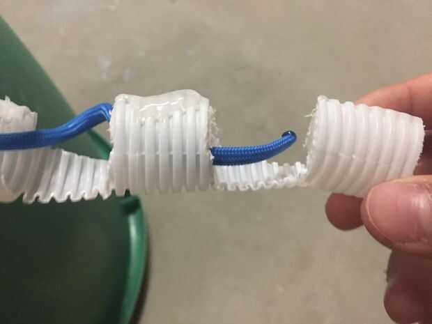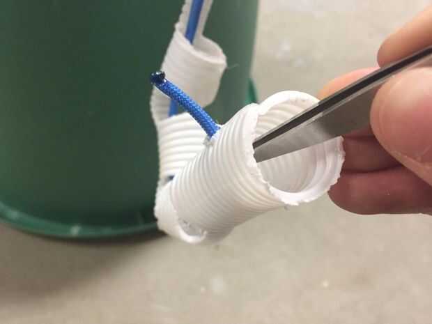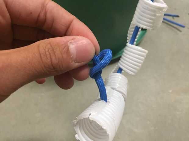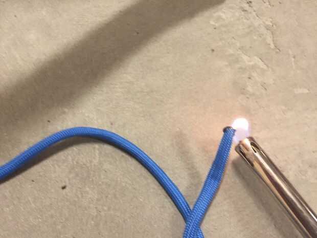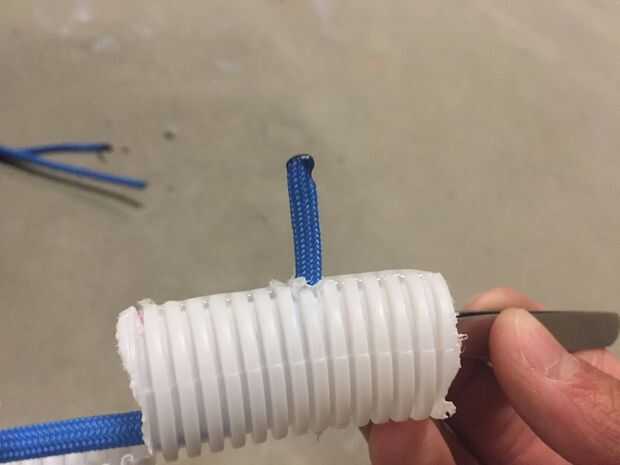 Tomar el paracord y corte en tres, 2' piezas largas. Tome un lado de cada pieza de paracord y derretir la punta con un mechero. Luego ejecute el extremo fundido de la cada paracord a través del tubo hasta alcanzar el agujero que perforó en el paso pasado. Pase la punta por el agujero y tire alrededor de una pulgada a través. Poner un nudo en él y enseñó desde el otro extremo. Hacer esto para cada dedo.