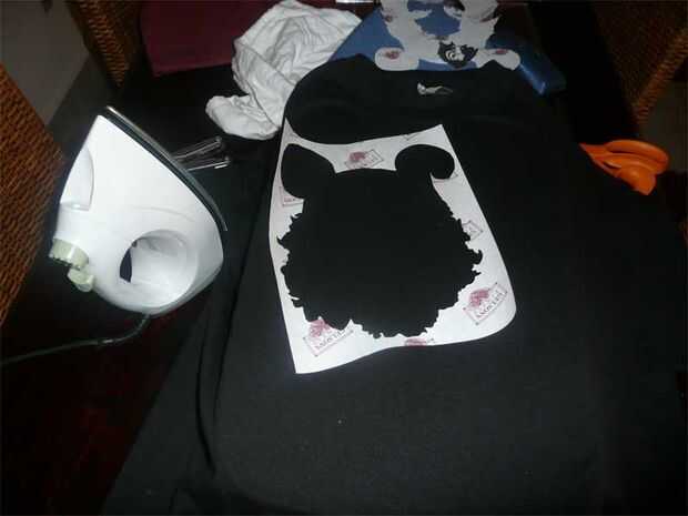 En primer lugar, la plancha la camisa. Luego planche la plantilla, el papel hacia arriba. Usar el ajuste más alto de mi plancha sin vapor mientras yo estoy manteniendo la plantilla recta y sin arrugas. Empecé primero con la pieza exterior. En términos generales, el centro del gráfico debe caer en el centro de las axilas de la camiseta. Estoy muy mal en mantener mis plantillas nivel--tenga cuidado. Con todas las piezas de la plantilla en su lugar, yo gire la plancha a vapor alta y asegúrese de que todas las esquinas se presionan hacia abajo. Ayuda a apoyarse en la plancha. Tengo verdaderos problemas conseguir pedazos minúsculos de la plantilla para pegar (como los agujeros dentro de Q, R, O, P, D, etc.) así que a veces sustituir la cinta de enmascarar.