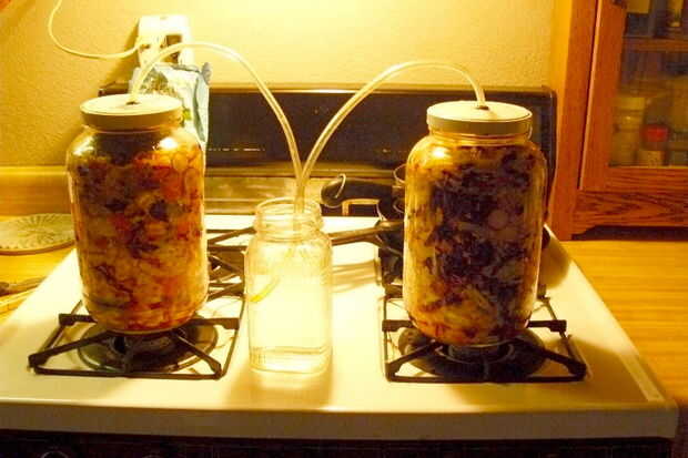 Tengo algunas tapas con anillos de goma donde puede insertarse un tubo. El tubo pasa a una jarra de agua. Esto permite que el aire escapar, pero no en... esta parte no es realmente necesaria, pero parece ayudar un poco en el proceso.