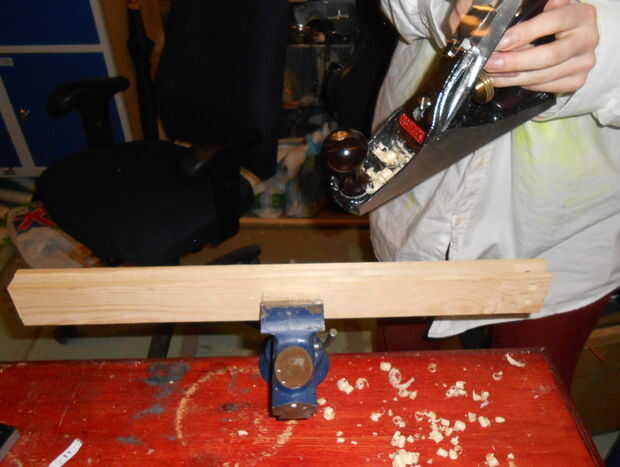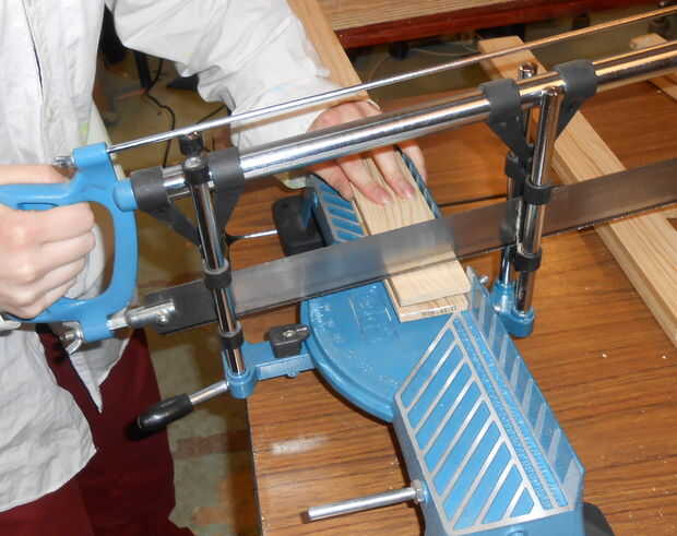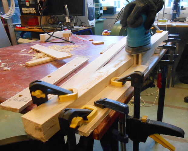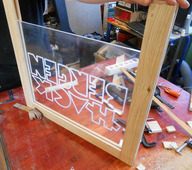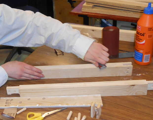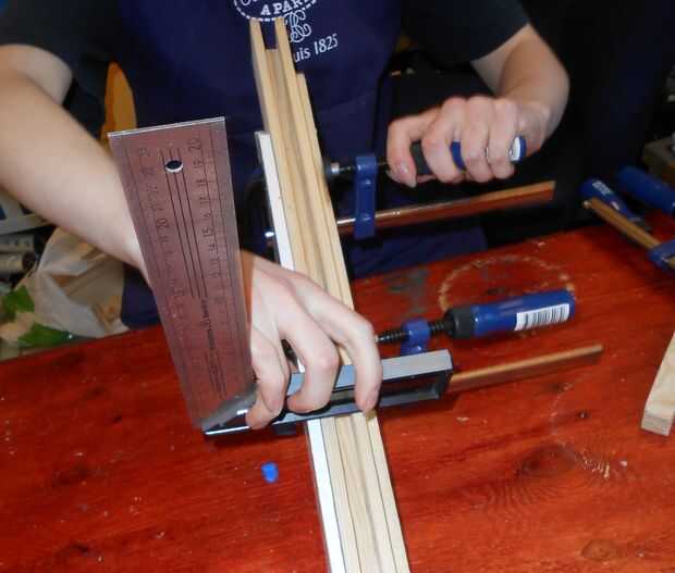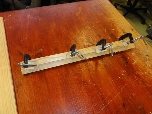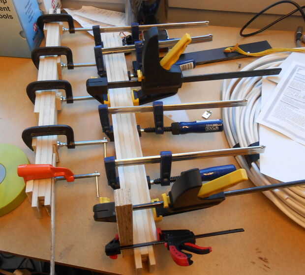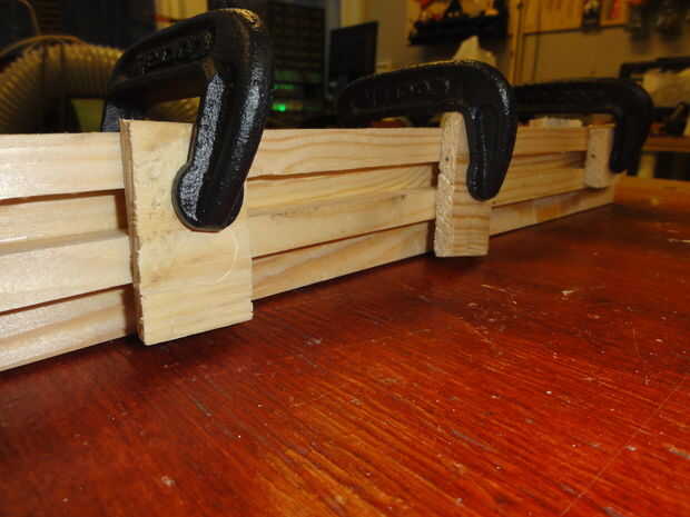 Un lado del bastidor está montado al igual que la parte superior, excepto que es las capas externas que se proyectan más allá de la capa interna esta vez. Aplicar el pegamento, alinee los bordes exteriores, pegan las piezas, fijarlo con la abrazadera y ponerlo a un lado para secar.