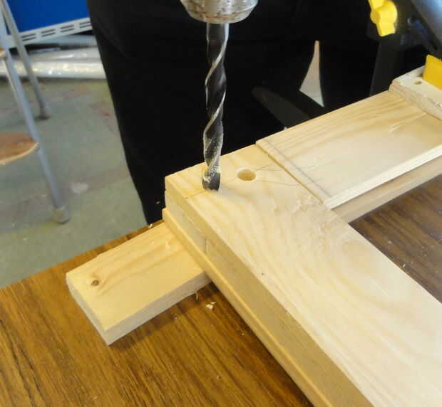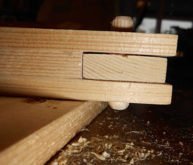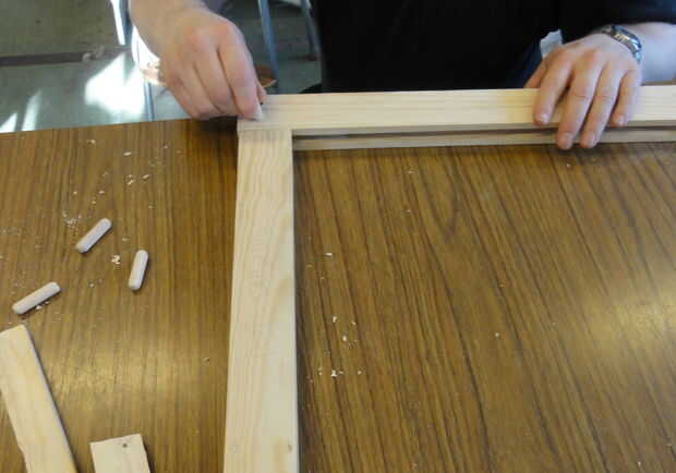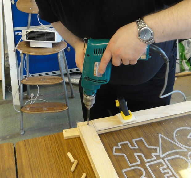 Tomó mucho de pensar antes de decidir a cómo íbamos a perno este lío todo juntos. Queríamos ser capaces de desmontar la muestra entera en el caso de tiras de LED u otra parte de que nunca debían ser reparado o sustituido, pero no queríamos enormes pernos de acero que se pega de los lados o bien (y el marco no es lo suficientemente grueso como para empotrar sin comprometer la integridad estructural de todos modos). Nos decidimos por la madera clavijas: suficientemente fuerte para mantener las cosas juntas, puede lijar al ras con el resto de la estructura, puede ser noqueado nuevo si surge la necesidad.
