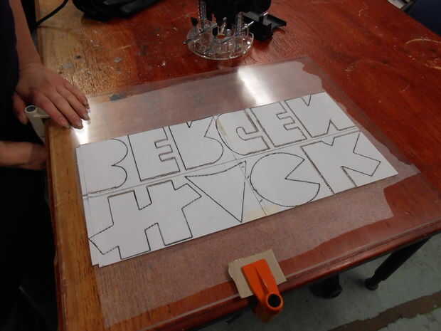 Dibujar o de lo contrario adquirir cualquier imagen desea en la señal. Para nuestro proyecto es el logo de Bergen Hack . Ver las cosas mejor cuando está grabados desde el reverso, así que recuerde el diseño del tirón. Abrir en su programa de elección y la escala para el tamaño que necesita.