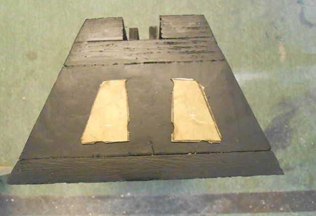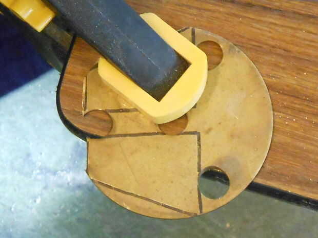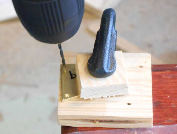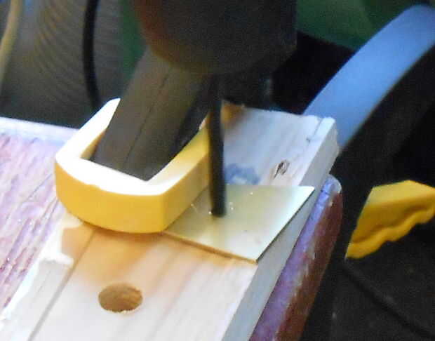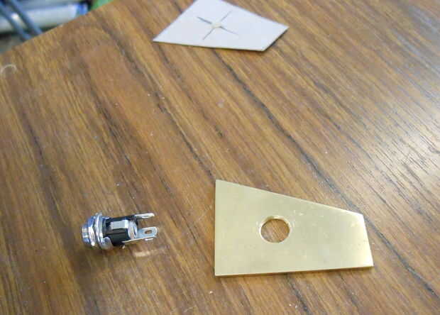 Se decidió que quería un poco más seguro punto de anclaje para el cable de alimentación que jamming solo la toma en un agujero en la madera, así que quimera algunos platos decorativos de bronce, porque negro + oro = elegante. Por supuesto están en consonancia con el conjunto trapezoidal lo este marco entero pasando.