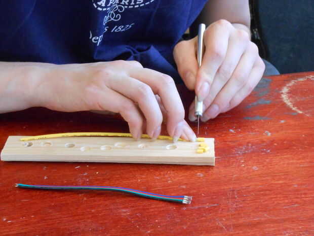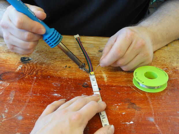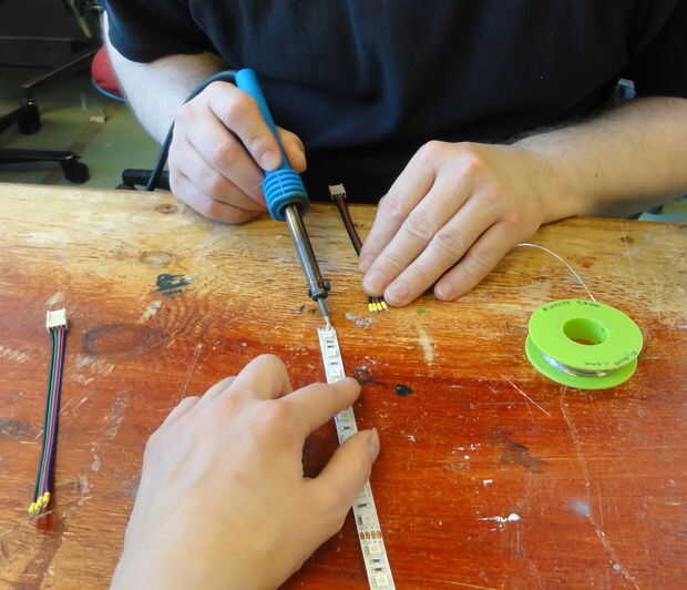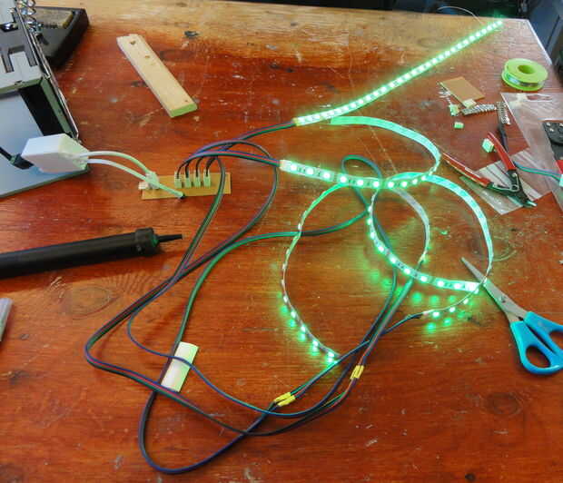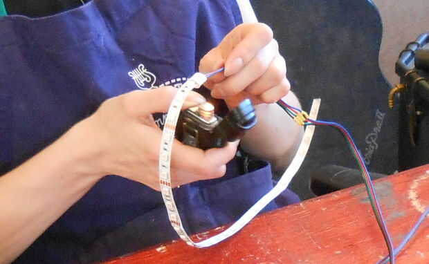 ¿Habría sido más simple tener un continuo LED tira con una conexión? Probablemente, pero ponemos una tira de LED separada en cada lado con el objetivo de eventualmente conectar a algunos microcontroladores para cada tira puede programarse individualmente. Por ahora todos ellos enchufe en la caja de un control que viene con el rollo de tira de LED.