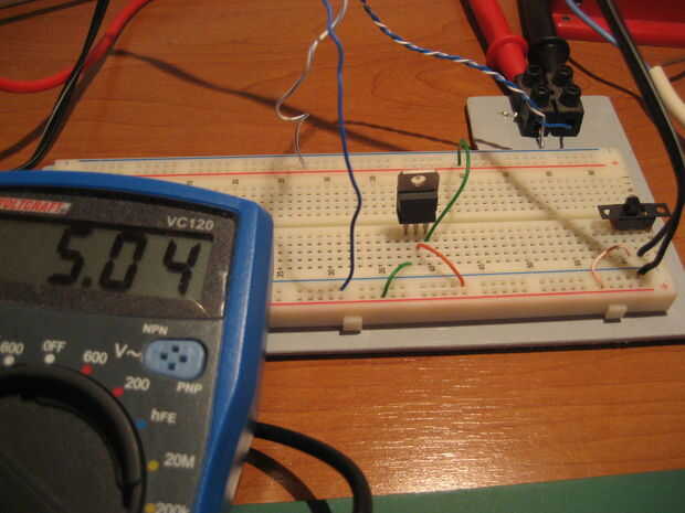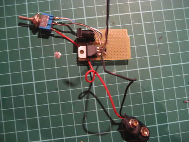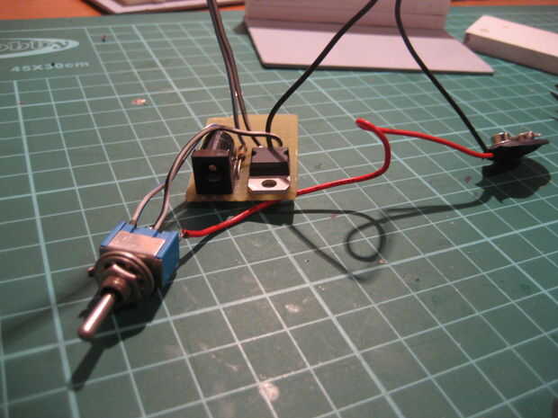 hice regulador de 5 voltios con el 7805 regulador y poner todo junto en una pequeña placa de circuito. Estaba pensando que será un buen ideal para hacerla portable, así que hice un interruptor para elegir entre batería o fuente de alimentación.
