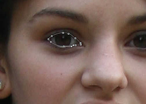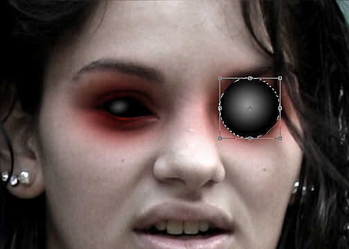 Crear otra capa en la parte superior y crear selección círculo sobre el ojo y usar el degradado conjunto de herramientas, para el degradado radial, desde el gris al negro. Reducir hasta conseguir el deseado punto culminante para el ojo. Arrastra esta capa detrás de la capa del modelo y colocarlo dentro de la abertura del ojo del lado cualquiera que sea su fuente de luz proviene de. Duplicar la capa y hacia el otro ojo.