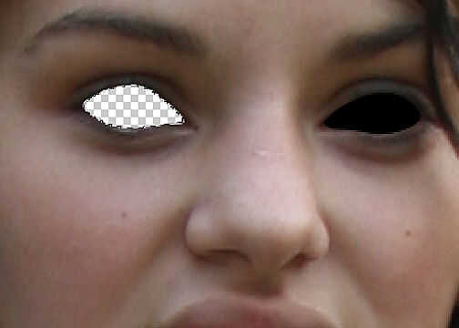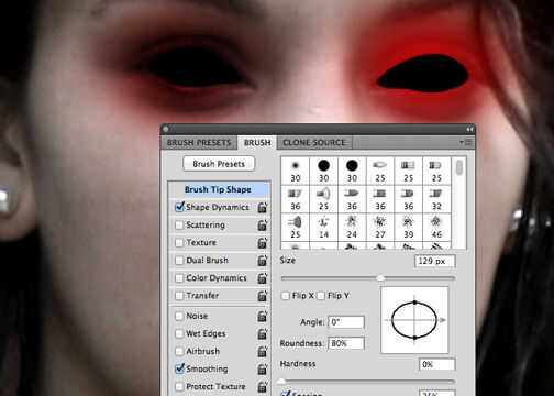 Seleccionar y quitar los ojos. Crear una nueva capa y coloque debajo de la capa del modelo y utilizar la herramienta Pincel para ennegrecer el área detrás de los ojos. Crear una nueva capa encima de la capa del modelo. Seleccione la herramienta pincel y luego abrir la paleta de pincel y ajustar el bush sobre el tamaño y la forma de los zócalos del ojo. Ajustar la dureza a 0 y establecer el color a rojo. Haga clic en el cepillo una o dos veces en cada cuenca del ojo. Jugar con los modos de mezcla (utilizado multiplicar) y te gusta la opacidad de la capa para el enrojecimiento de los ojos. Volver a la paleta de capas y coloque el cursor del ratón entre la capa que usted a pintado y la capa del modelo. Pulse la tecla de Alt/Opt. Verás que el cursor cambie. mientras sostiene el Opt/Alt, haga clic en directamente entre las dos capas. Esto creará una máscara de recorte que se enmascare u ocultar, las áreas rojas que se sientan sobre el corte de ojo salidas.