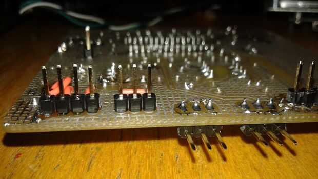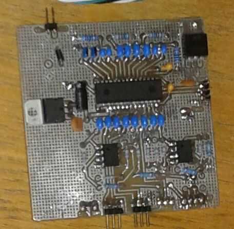 La placa es doble cara. En mi implementación, había grabado en casa y utiliza un método de transferencia de tóner y una simple mezcla de vinagre, peróxido de hidrógeno y la sal. No explico como hacerlo porque hay un número de instructables que hacerlo y muchas alternativas para hacer un mejor trabajo. Ya que no puedo hacer vias, todos los componentes de soldado deben soldarse en los dos lados, que hace que el resultado mirar muy sucio, como se puede ver en la foto, pero funciona y es sólido.