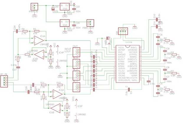 Los amplificadores diferenciales se construyen con dos LM456 de audio de bajo voltaje Op Amps. Un amplificador es el diferencial en sí mismo, y el otro es una referencia de tensión constante que simula una doble polarizado polarización de 2,5 voltios. He intentado emparejar impedancias de entrada y salidas.