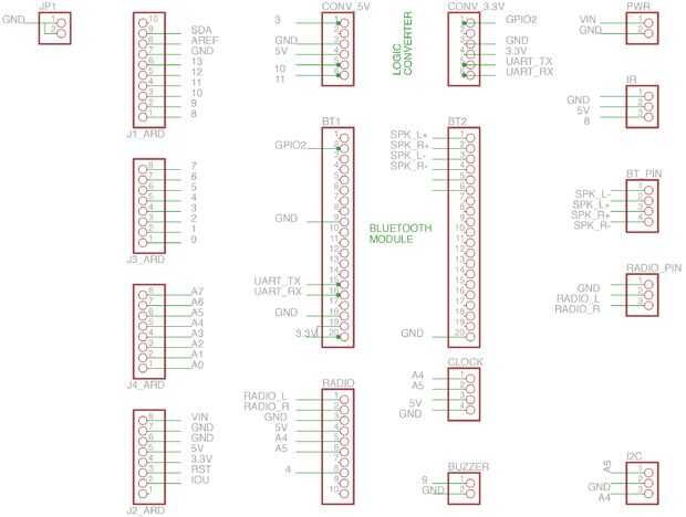 El tablero se hace de macho encabezados para conectar las tablas de desglose. En la parte superior tienes headers para la radio y el BT, y entonces estos tableros de arranque de la soldadura. La parte inferior contiene el convertidor de nivel y el reloj. Tenga en cuenta que estos dos se colocan hacia atrás. Los cables que se pueden ver en la foto son dos errores ya corregidos, por lo que en la versión subida de esta placa no hay cables.