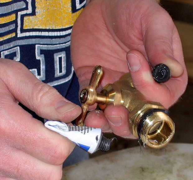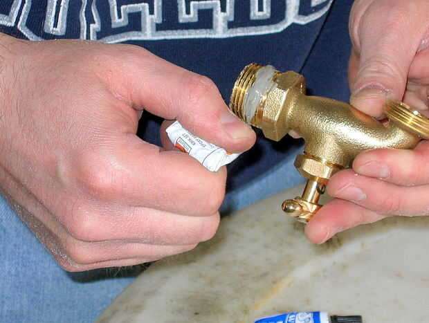 A continuación, romper el epoxi de dos componentes y aplicar una parte a la mitad de la base de la espiga roscada y aplique la otra parte a la otra mitad de la base de la espiga roscada. Como atornillar la espiga en el agujero el epoxi mezclarse y hacer el trabajo por usted! Si usted quiere, no puede ser una mala idea para difundir un poco extra epoxy en el exterior, sólo para darle un poco más de apoyo. Usé una llave ajustable para apretar el grifo extra apretado abajo. Espere cinco minutos para el epoxi para establecer empresa (usas las cosas rápida ¿no?) y listo!