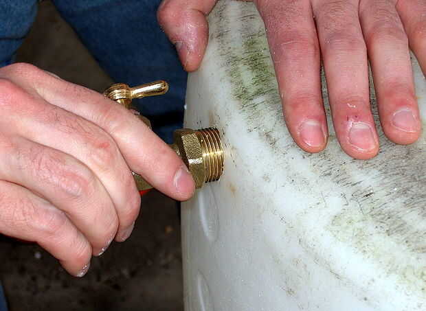 En segundo lugar, fijar la broca forstner para el taladro y en la parte inferior taladre un orificio en el lado. Si tienes un cilindro graduado sugeriría poner el agujero un poco por debajo de la marca de 5 galones. Esto permitirá que aún de suficiente espacio libre para el cañón para sentarse en la caja sin la llave de ser difícil de alcanzar mientras sigue permitiendo que a la gran mayoría del agua en el barril para drenar. Con la espita que compré, un forstner de 1/2 pulgada broca era un casi perfecto, aunque todavía tenía que ampliar con una herramienta giratoria un poco para que se ajuste perfectamente.