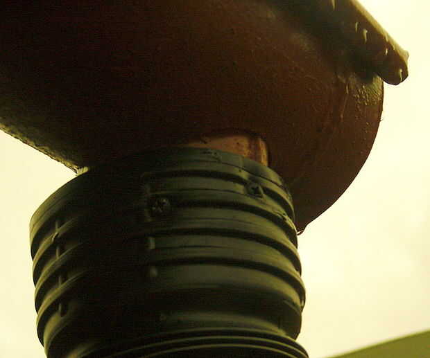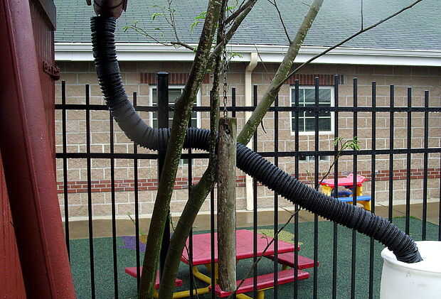 Utilizando dos tornillos pequeños que encontré en un cajón de basura de mi organizador de banco de trabajo (sugerencia: son en su mayoría todos los cajones no deseados), os adjunto uno de los extremos de la tubería a la bajada de agua. Luego estirar la tubería a una longitud de aproximadamente 6,5 pies y coloca el otro extremo el orificio de mi nuevo corte.