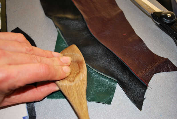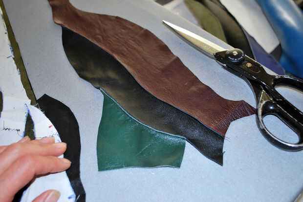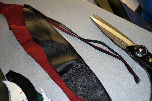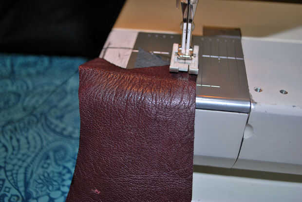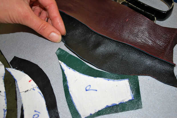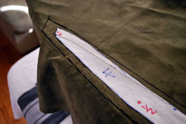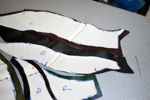 Cortar piezas 6-10, añadir márgenes adicionales como se indica. En los bordes sin anotaciones, añadí mi margen de costura de 1/4 estándar ". En orden, pieza 7 fue corte de los pantalones de capri suede verde oliva que desmantelaron en el tutorial pasado. Pieza 10 provenía de chatarra rock & roll cuero, pieza 9 de cuero verde remanente, pieza 8 de viejos pantalones de cuero y pieza 6 desde la blazer marrón. Puse 6 pieza sobre pieza 8 en las marcas de la ranura apropiada y suturan en la máquina de coser con una puntada recta y un margen de costura de 1/4". Había recortado la costura a una escasa 1/8" y pruebe la colocación de los patrones sobre la piel. Encajan bien, así que cubrió las piezas del patrón a la Junta y se trasladó a la siguiente pieza.