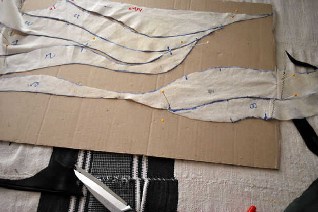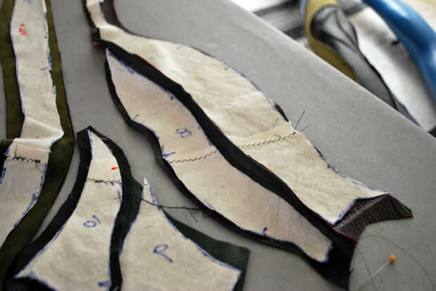 He probado la colocación de la pieza 9, cosidas a la pieza 8 y recortado por las costuras. Luego fui cada costura con el dorso de una cuchara de madera para alisar queden abiertas.