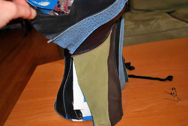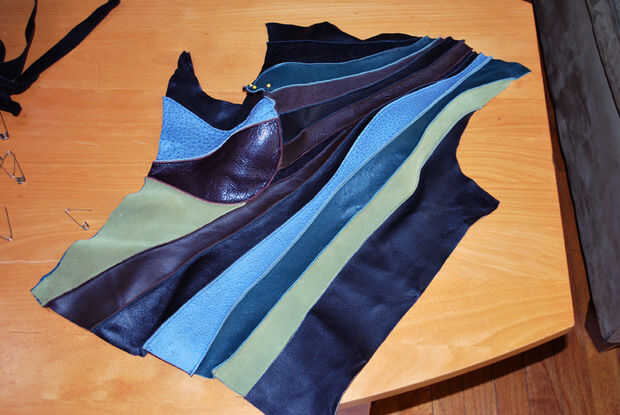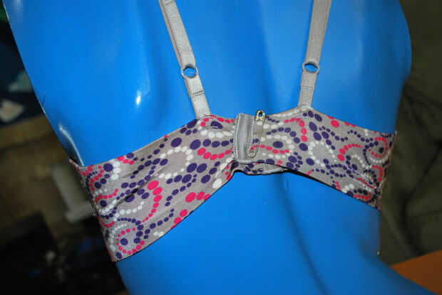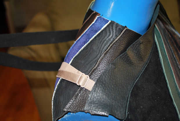 Saqué el torso de maniquí de tienda para comprobar sobre el cuero que cubre, hubo algunas alteraciones y las costuras al pin out, pero antes de que podía llegar a ese punto quería deshacerse de las elásticas entrecruzadas. El elástico y pernos de seguridad solía sostener el cuero a la forma era voluminoso y el sujetador no ajuste bien.