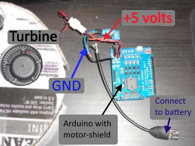 Turbina, Arduino y protector de motor están conectadas a la batería por los cables de alimentación (o un banco de alimentación mediante un cable USB).